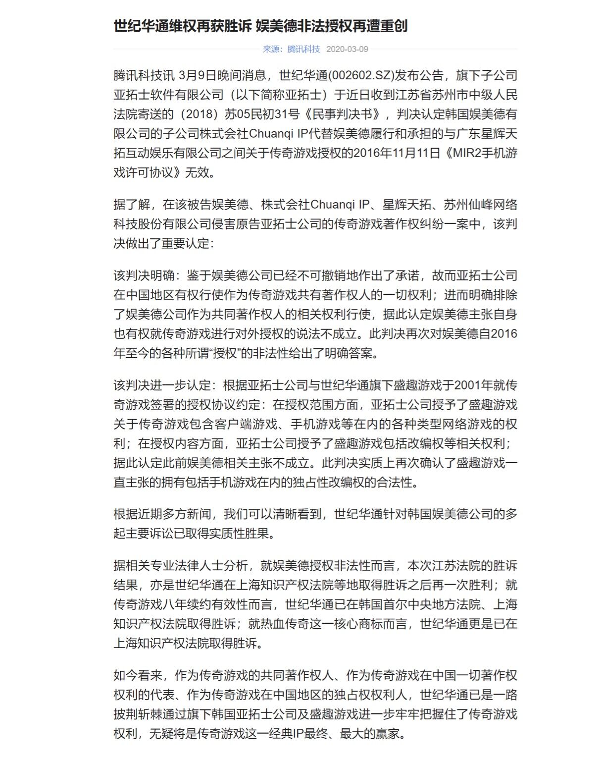 世纪华通维权再获胜诉,娱美德非法授权再遭重创