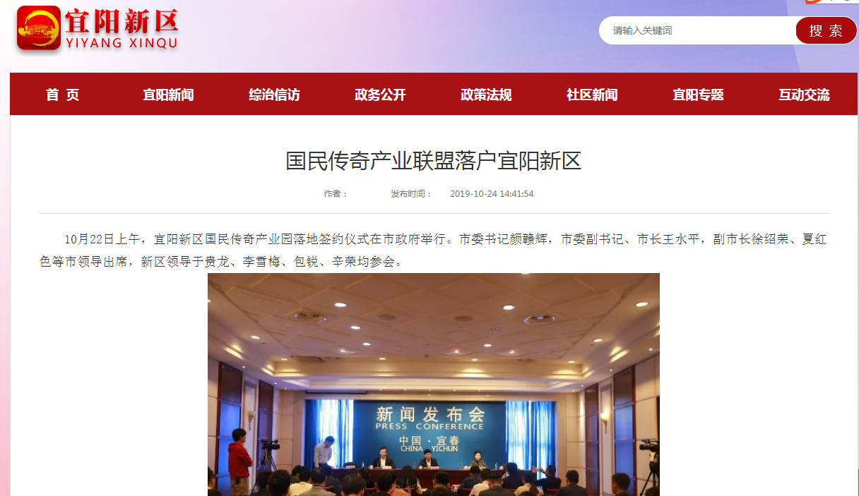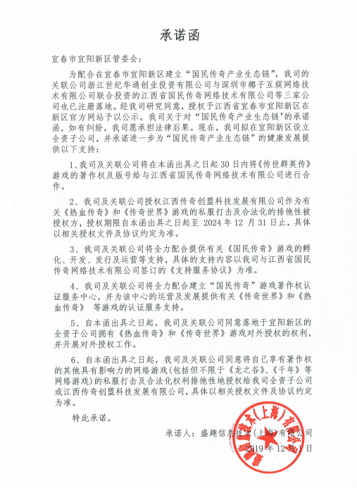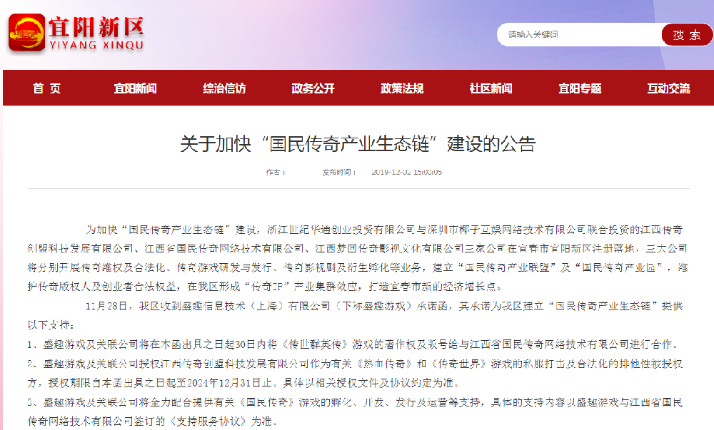12月2日,江西省宜春市宜阳新区在其园区网站上发布《关于加快“国民传奇产业生态链”建设的公告》,公告称其联合传奇创盟等三家游戏公司,建立“国民传奇产业联盟”及“国民传奇产业园”,维护传奇版权人及创业者合法权益,形成“传奇IP”产业集群效应,打造宜春市新的经济增长点。